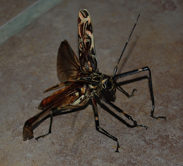 Harlequin beetle, (acrocinus longimanus), large tropical american beetle with an elaborate variegated pattern of black with muted red and greenish yellow markings on its wing covers.